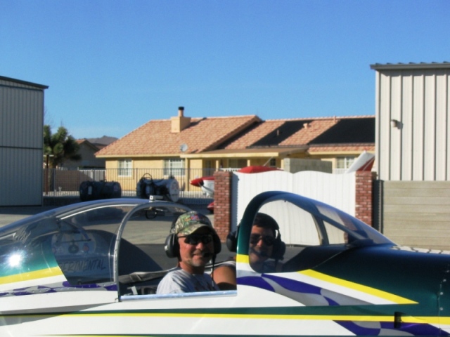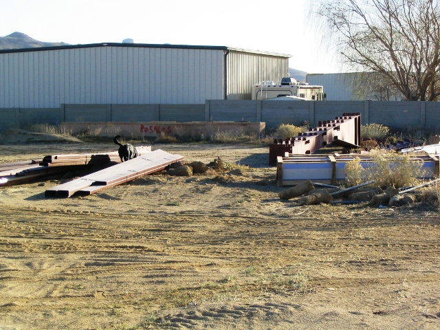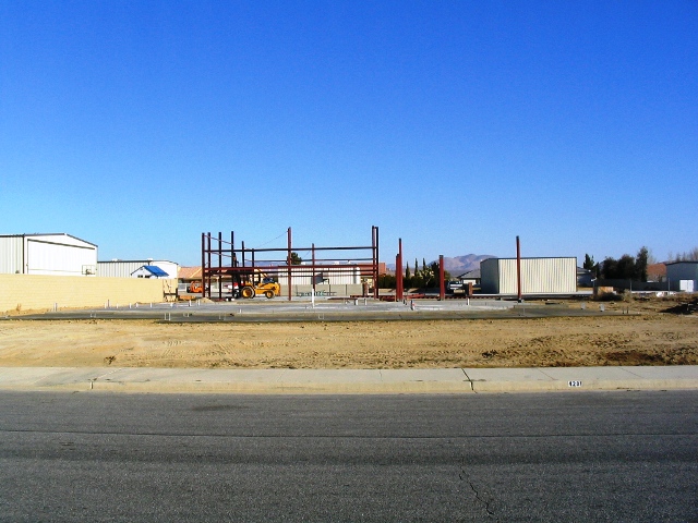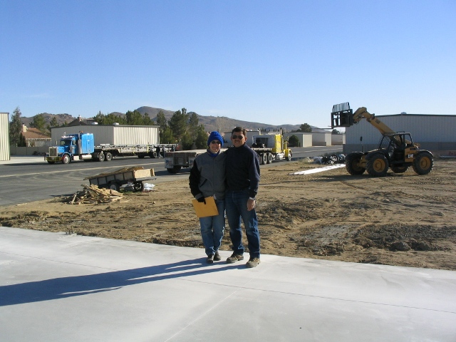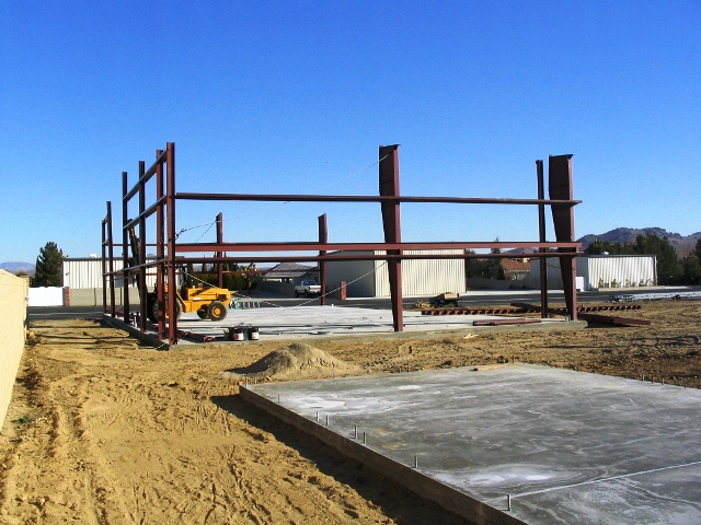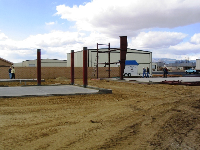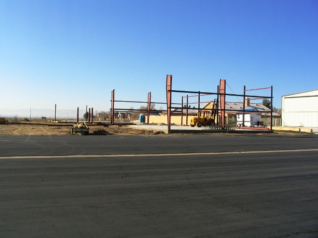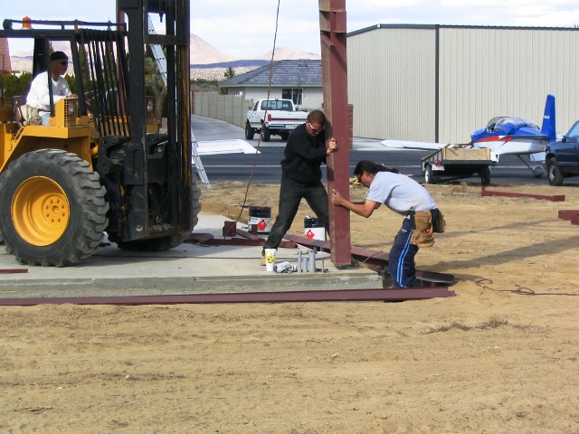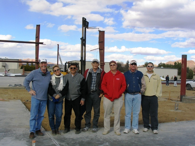 We had a nice breakfast with 22+ people (12 RVs plus Dan Hall in the RV-0.5 :-) Five of the RVs flew back to Rosamond with us to check out the house, and we were happy to find the hangar crew there with a couple of pieces of 'red steel' already in place.