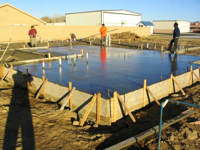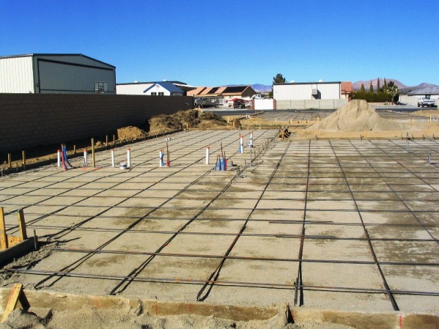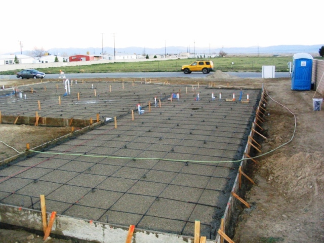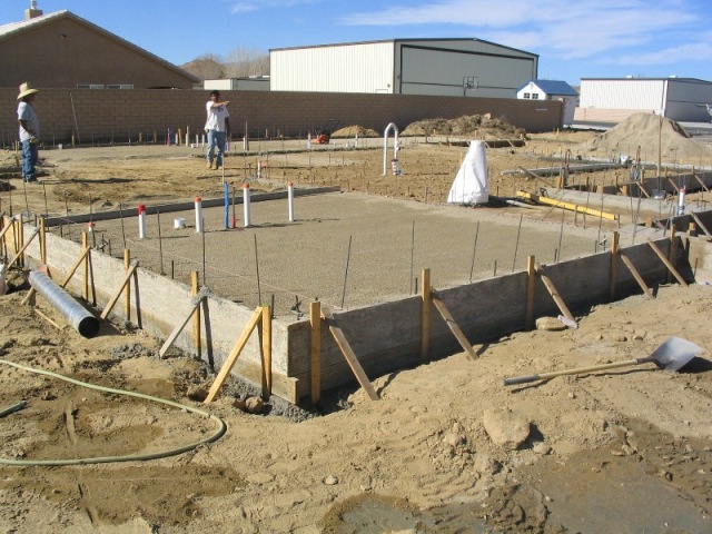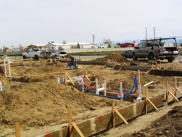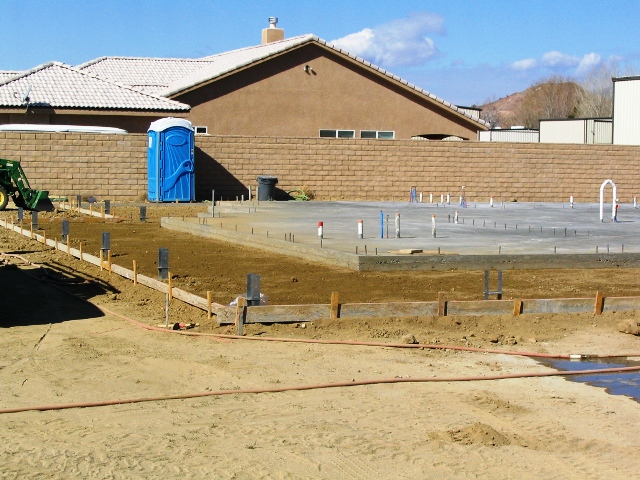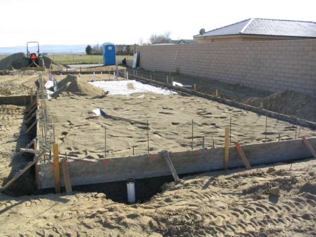 On Monday, February 6, the house footings were poured followed by covering up the pipes and laying down the moisture barrier; plastic sheeting (visqueen). The hangar also got it's visqueen and covered by sand.
