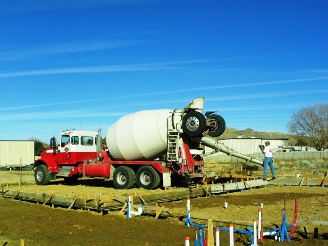Monday, February 13 started with the last 2 cement trucks arriving to finish off the garage. It would have been TOO MUCH work to complete both the house and garage the day before when the house cement was poured.