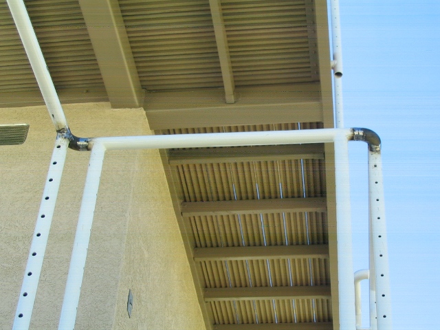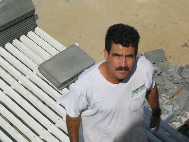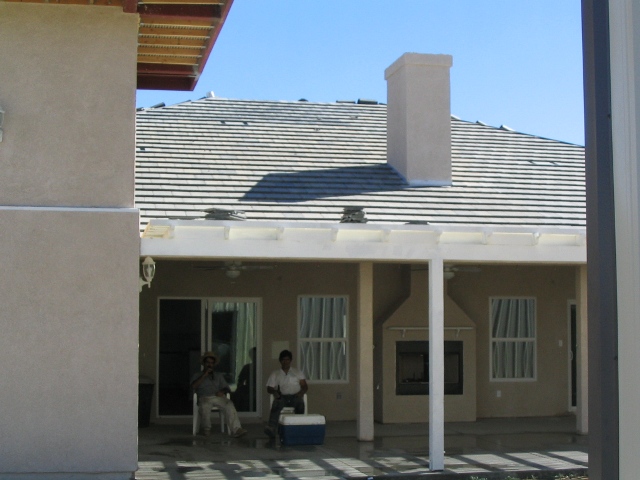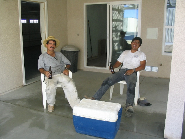 Here is Alberto & Rudy sitting under the now-working misters and having a 'cold-one' after spending a hot day roofing the back of the house :-)