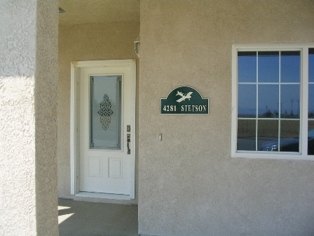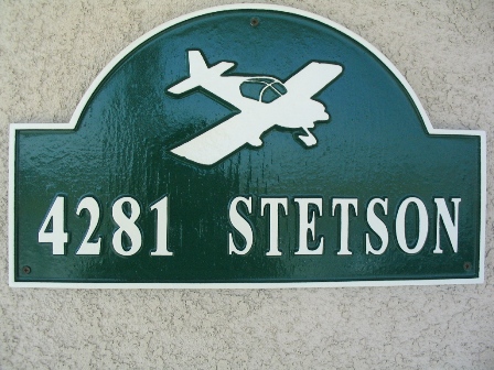 I also put our new address plaque on the house, custom sand-cast by Bryson Wagner, owner of Bryson's Stuff. I was searching the internet for a plaque when I came across his website which had what I was looking for... except it had a picture of a Velocity aircraft. If I could provide a silohuette, he'd put the RV on the plaque.