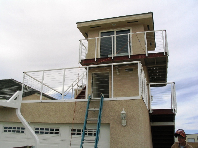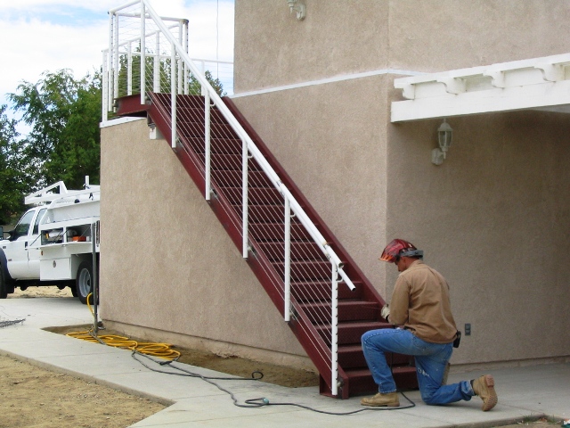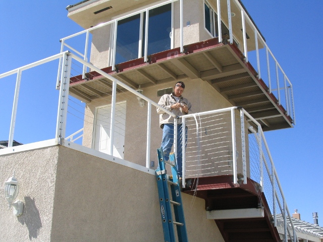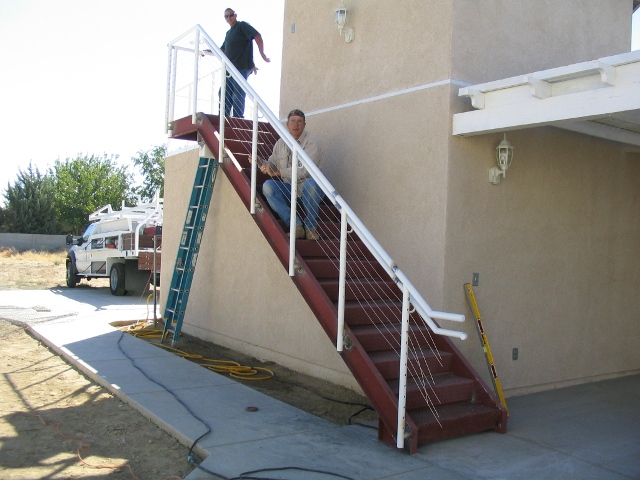 Wednesday, the 'gas man' came and connected our natural gas to the house (with meter. LOTS of progress on the handrails too! It was a very tedious job 'stringing' all that stainless-steel wire and fittings, which in the following pictures, is not yet pulled tight. Neil & Jessie plan to finish up Thursday morning, and we called for final inspection for Friday morning. By the way, Neil (with the bandana) is a single/multi-engine airplane and helicopter pilot ;-)